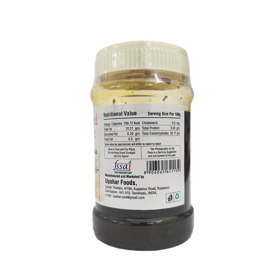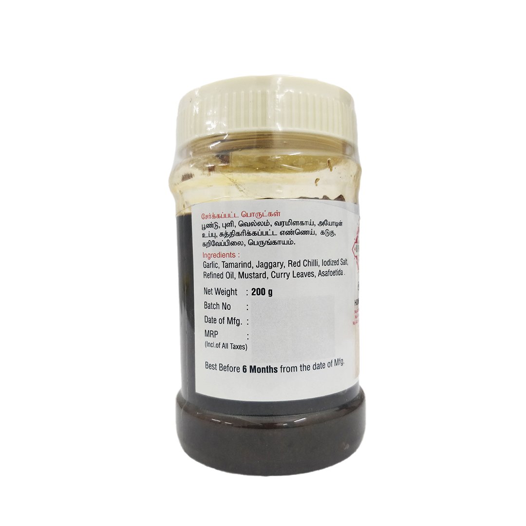 Grinded Garlic Pickle is a traditional homemade delicacy prepared with freshly ground garlic cloves, blended with aromatic spices, tamarind, and gingelly oil. This spicy, tangy pickle not only enhances the taste of your meals but also carries the health benefits of garlic, known for boosting immunity and digestion.