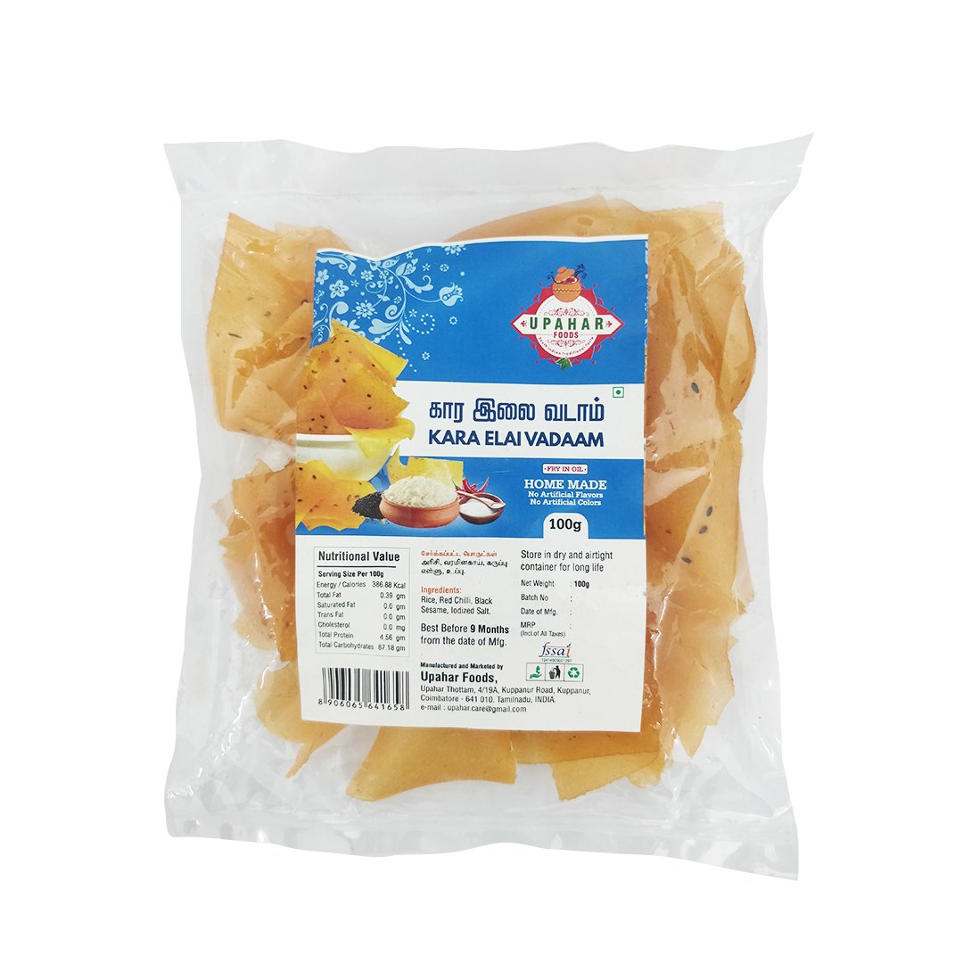 Kara Elai Vadaam is a spicy and flavorful South Indian rice-based fryum, loved for its bold taste and crispy texture. Made using rice flour, cumin, green chillies, sesame seeds and mild spices, this vadaam is carefully sun-dried on plantain leaves to preserve its authentic traditional flavour. Once fried, each piece puffs up light, crunchy and irresistibly delicious.