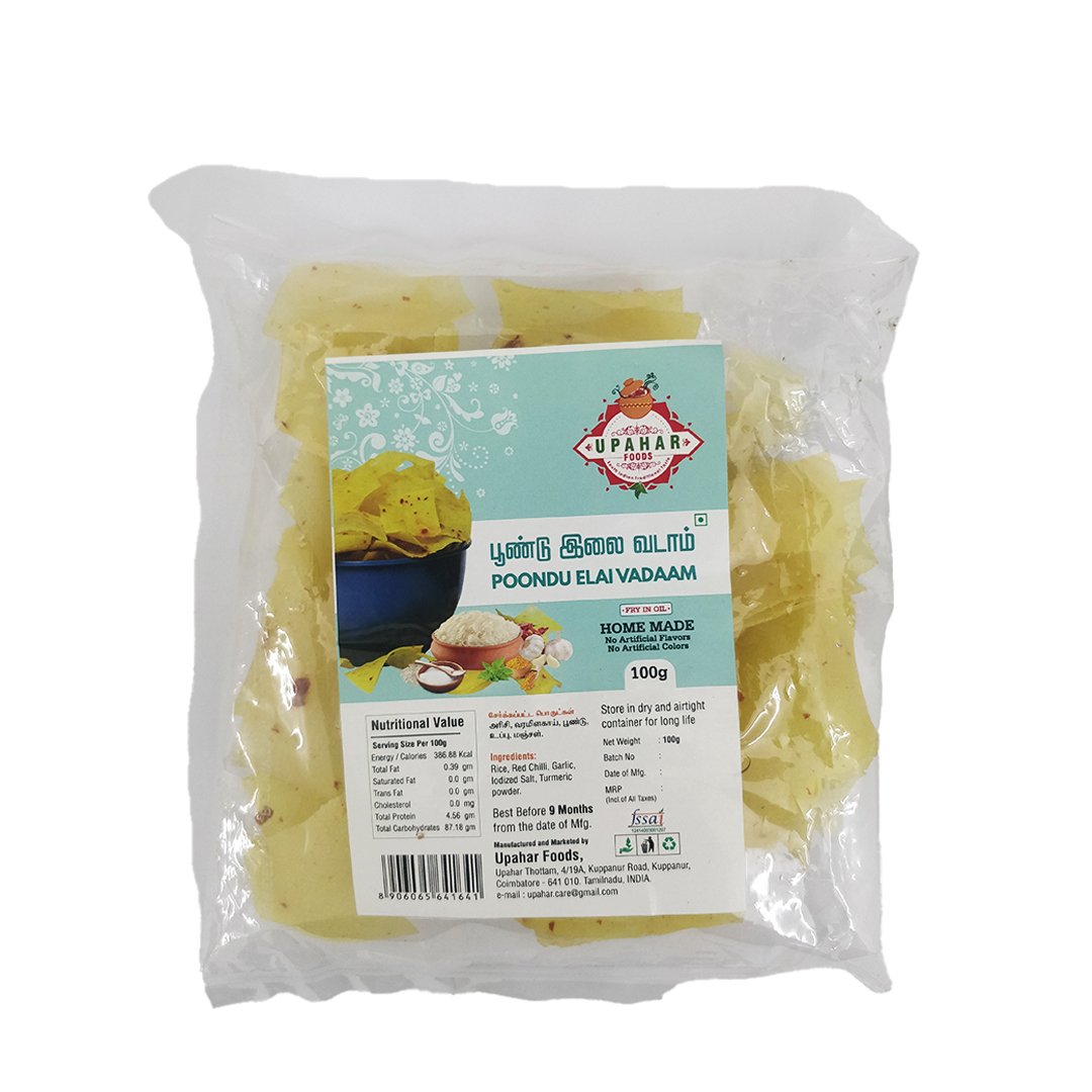 Poondu Elai Vadaam is a traditional South Indian delicacy made from garlic leaves, rice batter, and mild spices. Sun-dried to perfection, these vadaams turn extra crispy when deep-fried, giving a unique garlic flavor with every bite.