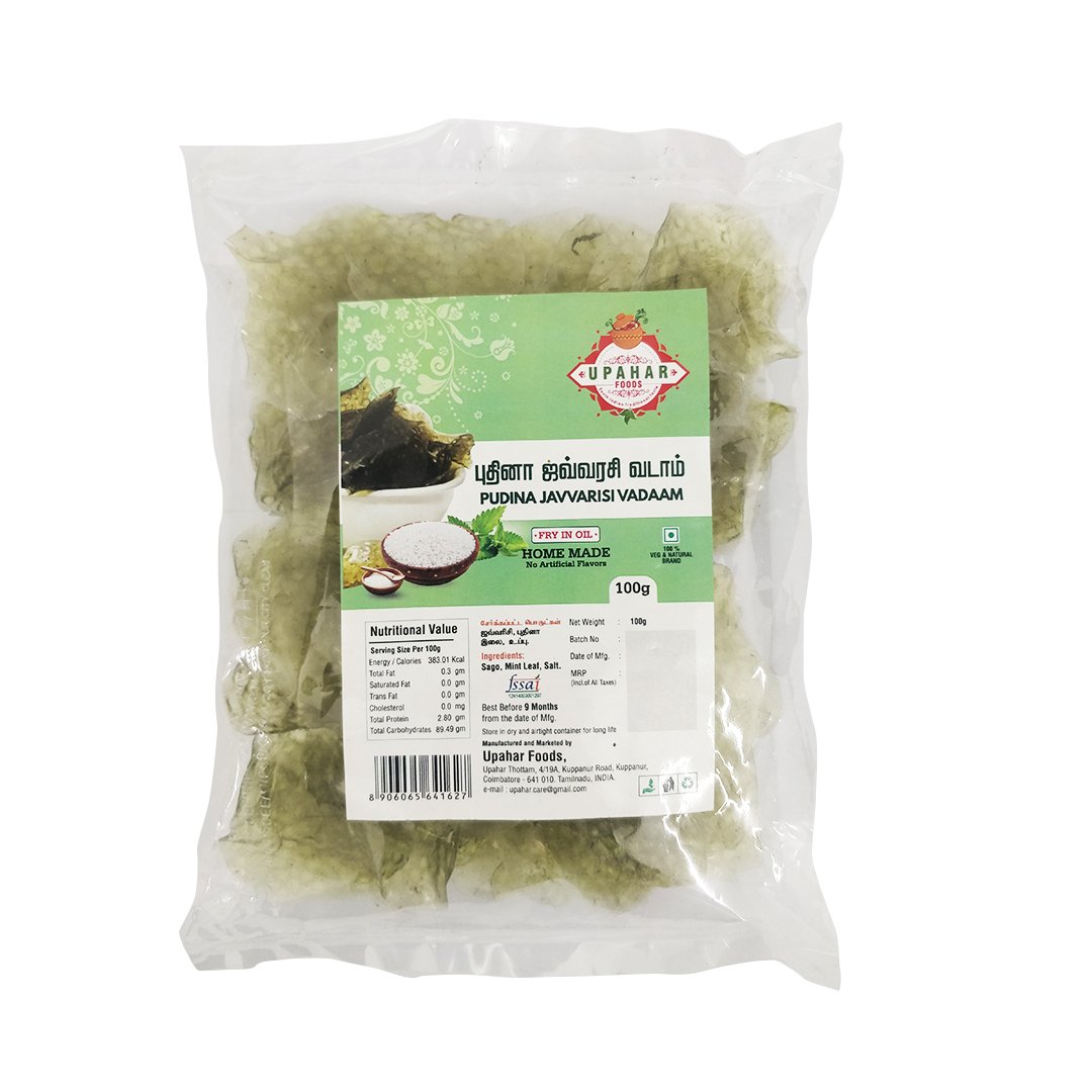 The mint not only adds a refreshing aroma but also enhances the taste, making it a unique and healthy choice compared to regular fryums. Perfect as a side dish for meals or enjoyed as a crunchy tea-time snack, Pudina Javvarisi Vadaam brings the authentic homemade touch to your plate.