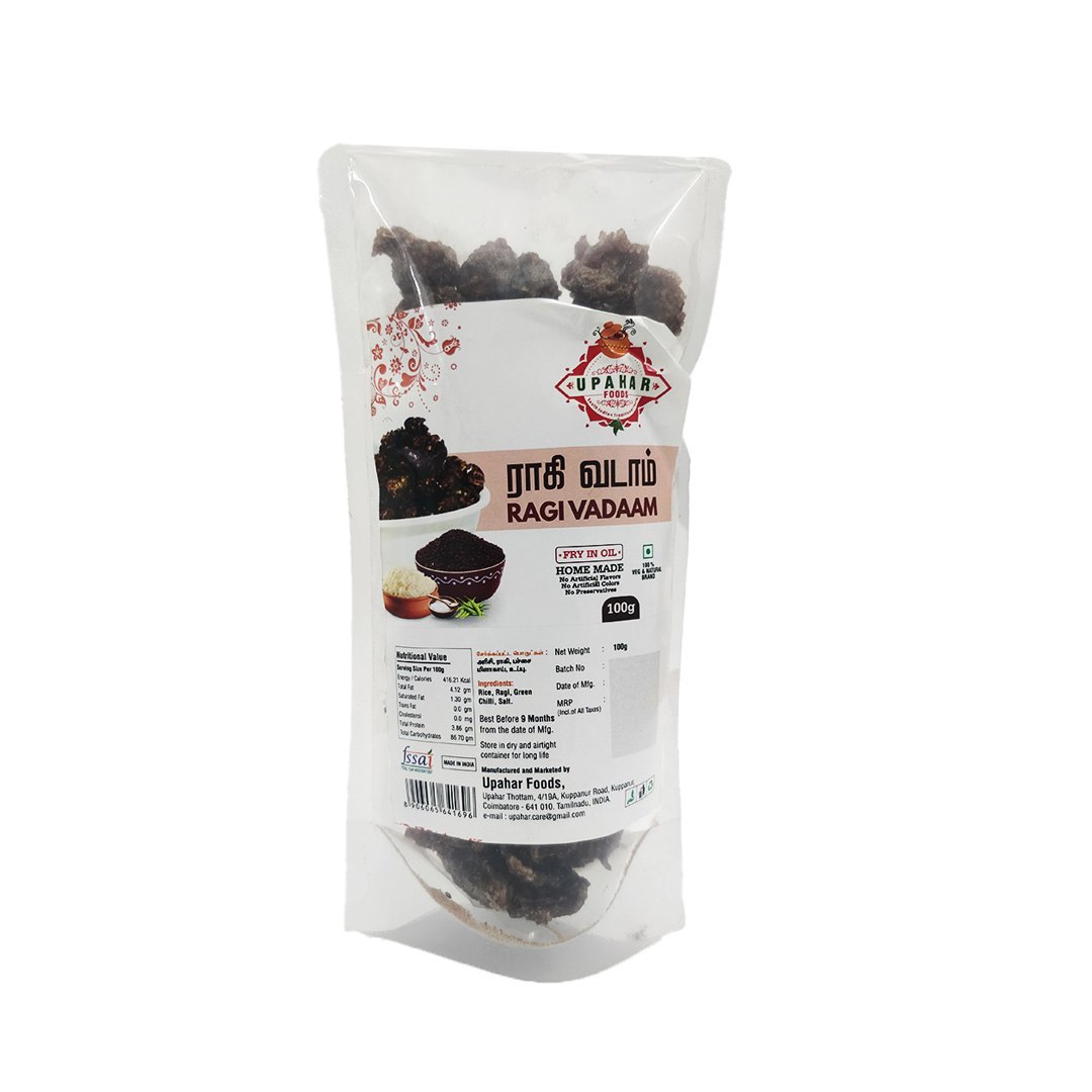 Bring home the goodness of Ragi Vadam, a traditional South Indian fryum prepared using finger millet (ragi) and natural spices. Ragi is a powerhouse of calcium, iron, and dietary fiber, making this vadam a healthy and tasty addition to your meals.