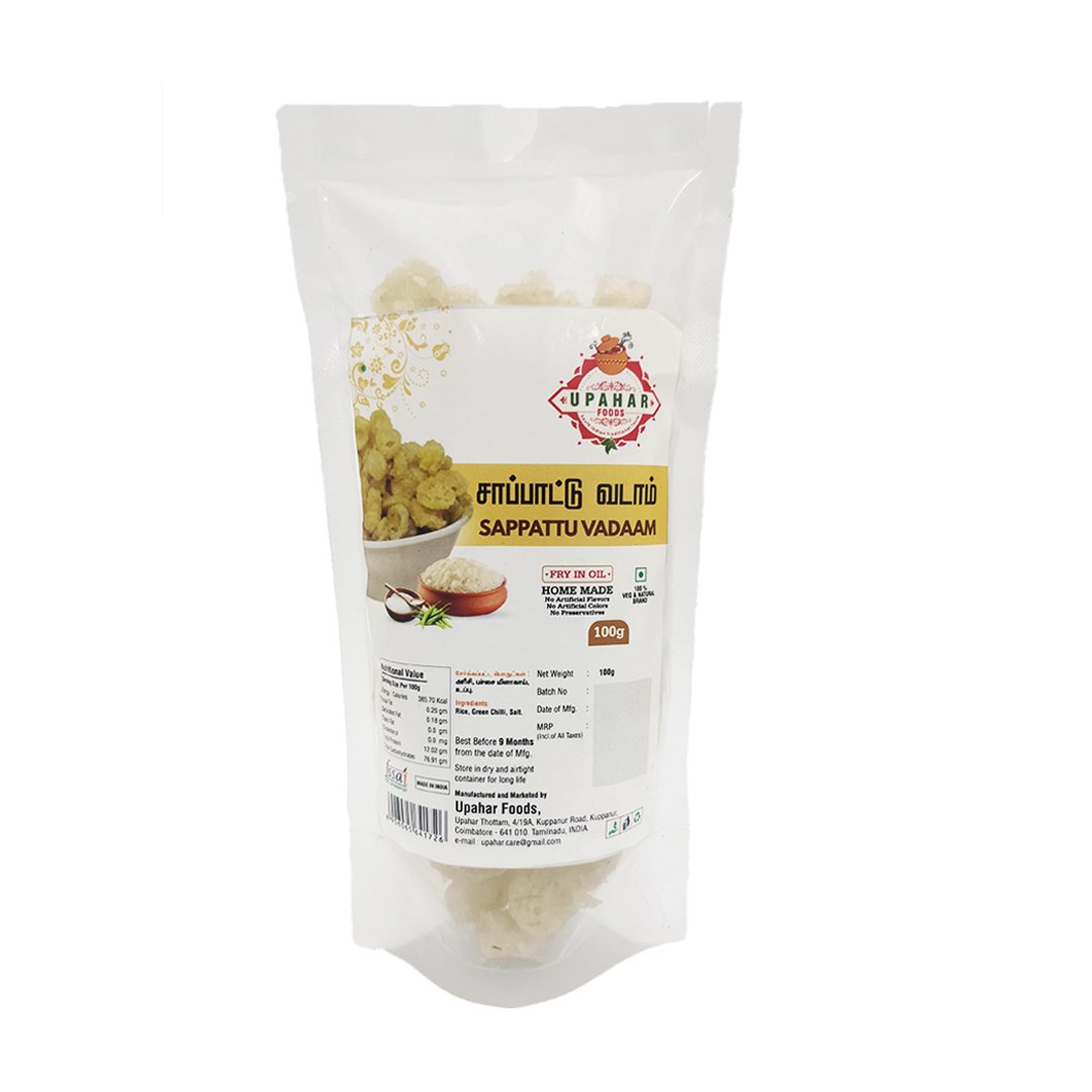 Relish the authentic flavors of Tamil Nadu with Sappattu Vadaam a classic homemade vadaam prepared using rice flour and natural ingredients. Traditionally sun-dried to perfection, these vadaams turn light and crunchy when fried, making them an excellent accompaniment to rice, sambar, rasam, or even as a tasty tea-time snack.